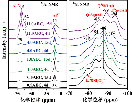 图3 27Al、29Si NMR光谱揭示了硅阴离子浓度对产物中离子占位、结晶过程中离子迁移等微结构特征、以及产物物相纯度和结晶度等矿物学特征的影响。