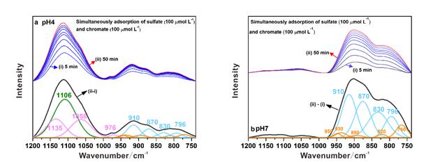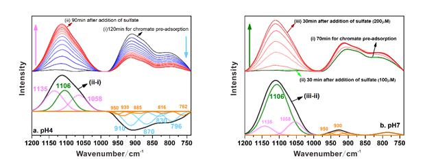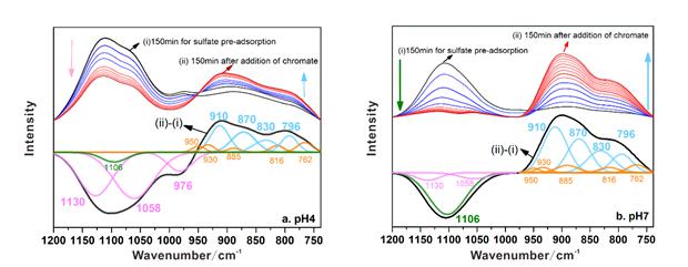 pH4(a)和pH7(b)条件下,铬酸根竞争硫酸根的红外动态光谱图及其谱峰拟合