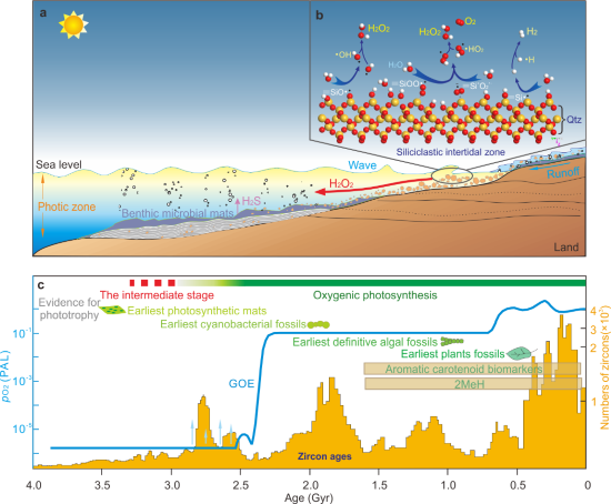 研究团队选取沉积物中丰度最高的矿物—石英作为研究对象,通过在模拟的太古代大气环境(PO2<10-6 atm)中开展石英机械磨蚀和石英–水界面反应的实验,发现在无氧条件下石英表面可以产生充足的H2O2和O2(图2)。太古代砂质海岸原位产生的H2O2通量可达到4.87×1011个分子每平方厘米每秒,这种矿物机械化学反应产生H2O2的速率远高于大气光化学的H2O2通量(106个分子每平方厘米每秒),足够形成和维持太古代的局部氧化环境(图3)。即便是现代蓝细菌微生物席中的O2生成速率(9.63×1013个分子每平方厘米每秒),也仅比太古代海岸原位产生的O2通量高约400倍。这表明,在浅海高能环境中,石英的磨蚀过程是一个具有重要地质意义的产氧途径。