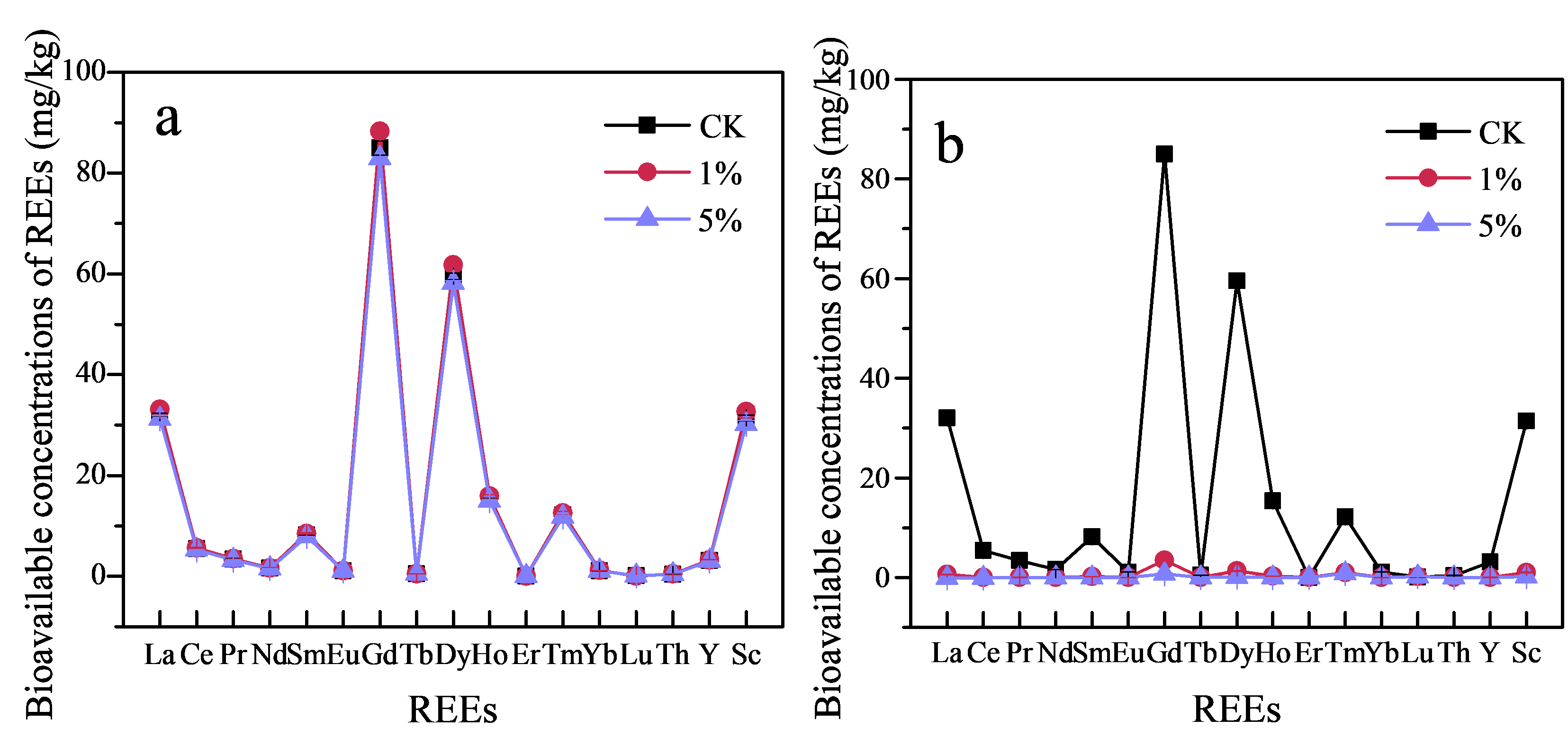 图2. 投加不同比例Mt(a)和KMt-P(b)土壤MgCl2可提取态REEs含量的变化