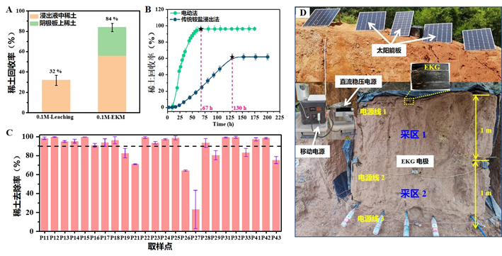 研究团队先后完成了土柱模拟实验、放大试验和场地示范。与传统铵法开采技术相比,电动法稀土开采的效率显著提高(图2A)。实验表明:电动法在67 h稀土回收率可达到96%,而传统铵法在130h稀土回收率仅为60%左右(图2B)。基于模拟实验和放大试验的结果,研究团队在广州周边某稀土富集区进行了原位场地试验。结果表明,仅11天,电动法稀土开采效率即可达到90%以上,且浸取剂用量较传统铵法降低了约80%,取得了良好的效果(图2C2D)。