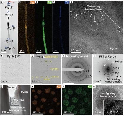SR-nanoXCT实验结果显示,裂隙金在黄铁矿内呈箔片状产出,根据组成可以分为富金和贫金富碲两类,前者为单晶银金矿,后者则为多晶的一种未知碲硫化物矿物(化学式为Ag8Fe0.94Te4.83S3.99);而TEM研究则表明,在黄铁矿基体中存在着大量贫金富碲的纳米颗粒,在黄铁矿裂隙同样也能观察到银金矿的纳米颗粒(图2)。基于上述地质现象,研究团队推测黄铁矿基体中贫金富碲的纳米颗粒可能为裂隙金的形成提供了物质来源。金、银等元素在黄铁矿中呈杂质存在,因此可以将金向裂隙中迁移与聚集过程实际上是杂质元素或纳米团簇在黄铁矿晶格中发生的移动与扩散的过程,这一个过程受构造应力和物理化学条件变化的驱动。这种固相扩散使得杂质相逐步迁移至各类晶格缺陷、晶格点阵截止面(晶体表面)等低晶格能区域汇聚,最终体现为晶体的“自净化”和成矿元素超常富集现象;DFT计算充分证实这一个过程可以自发进行。