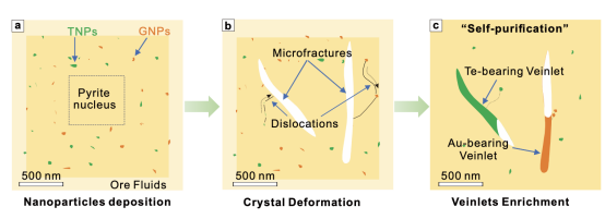 研究团队将黄铁矿中金的“自净化”固相迁移与超常富集过程分为两个阶段:(1)黄铁矿生长过程中将富金的纳米颗粒包裹进黄铁矿内部;(2)在构造应力和(或)物理化学条件变化的驱动下,黄铁矿晶体发生形变和破裂,内部纳米颗粒通过固相的“管道扩散”方式在裂隙中富集(图3)。本研究不但成功地解释了黄铁矿裂隙中箔片状金的形成过程、揭示了高品位金矿床(矿体)的形成机制,而且对黄铁矿型金矿石的选冶也一定的启示。