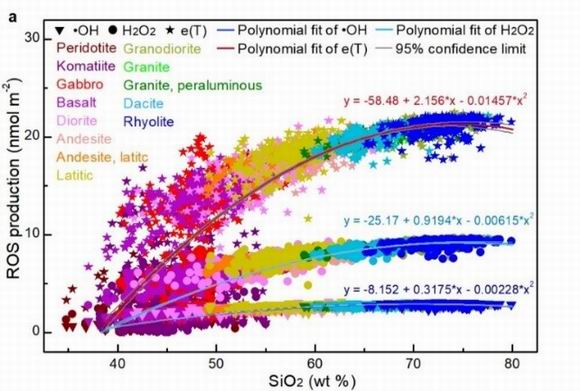 为了寻找太古代具有重要地质意义的氧化剂来源,中国科学院广州地球化学研究所何宏平研究员团队基于前期发现的石英表面自由基与水反应产生氧气(O2)和过氧化氢(H2O2)等活性氧(ROS)的机制,选取了岛状、环状、链状、层状和架状结构的硅酸盐矿物,开展了太古代物理风化环境下矿物–水界面作用的模拟研究。研究发现,大多数硅酸盐矿物经机械磨蚀后均可产生ROS,架状结构矿物(长石和石英)中Si–O键均裂更容易形成自由基(SiO•和SiOO•),其ROS产量显著高于橄榄石、辉石等具低聚合度硅氧骨架的矿物(图1)。通过大数据汇编分析发现,在太古代时期,大陆地壳物理风化导致的ROS产量随地壳SiO2含量的升高和构造运动的增强而显著增加(图2)。