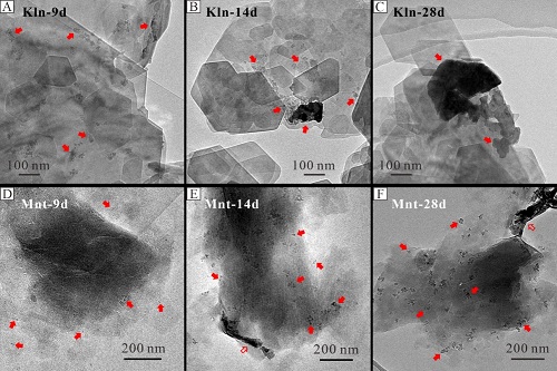 图1. (A-C)高岭石体系不同反应时间样品的TEM图;(D-F)蒙脱石体系不同反应时间样品的TEM图。(实心箭头指示MnOx,空心箭头指示蔷薇辉石)