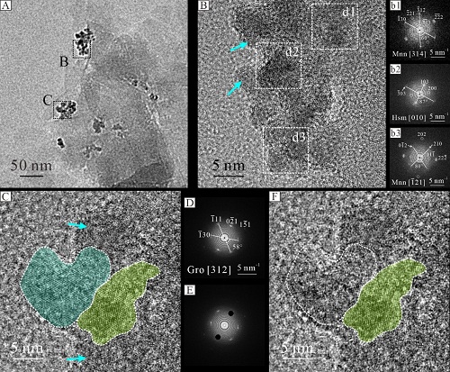 图3. 蒙脱石体系中MnOx的结构特征:(A)蒙脱石表面的MnOx聚集体;(B-F)选定区域的HRTEM图和对应FFT花样,表明聚集体中存在无定型MnOx、黑锰矿、斜方水锰矿和单斜水锰矿纳米颗粒;其中斜方水锰矿聚集体由两个相邻且取向相似的纳米颗粒组成(C-F)。
