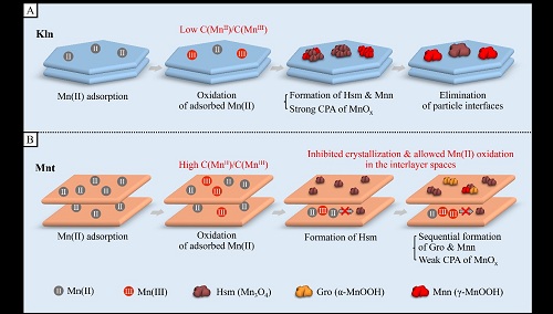 (1)高岭石、蒙脱石表面都能催化Mn(II)氧化为Mn(III)并结晶形成MnOx。(2)高岭石和蒙脱石表面的不同性质(如表面电荷、吸附能力)使二者诱导形成的MnOx具有不同矿物相(高岭石表面形成黑锰矿、单斜水锰矿,蒙脱石表面形成黑锰矿、斜方水锰矿和单斜水锰矿)、形态和尺寸(高岭石表面MnOx为尺寸较大的纳米聚集体,蒙脱石表面为分散良好的细小纳米颗粒)。蒙脱石较高的溶解度还导致Mn(II)与Si(IV)离子在其表面共沉淀形成蔷薇辉石(MnSiO3)。(3)在高岭石表面,MnOx纳米颗粒可以通过CPA生长;在蒙脱石表面,这种CPA过程亦可发生,但受到MnOx纳米颗粒与蒙脱石表面之间强烈静电固定作用的抑制。(4)高岭石层间域难以吸附Mn(II);蒙脱石层间可以吸附Mn(II),层间Mn(II)可氧化为Mn(III),但这些Mn(II/III)离子受层间限域作用影响,无法结晶。