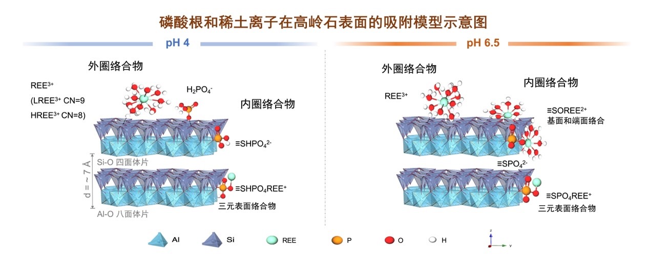 针对这一科学问题,中国科学院广州地球化学研究所矿物学与成矿学重点实验室博士生周靖雯在导师梁晓亮研究员和中国科学院地球化学研究所于文彬副研究员的指导下,采用批量吸附实验和表面络合模型计算等方法探究磷酸根和稀土离子在高岭石表面的共吸附行为和机制。研究发现:磷酸根增强稀土离子在高岭石表面的吸附作用。在弱酸性条件下,高岭石主要通过静电引力作用吸附稀土离子,磷酸根的存在增加了高岭石表面的负电荷从而促进稀土离子的吸附,但基本不影响分异特征。随pH升高,稀土内圈络合物含量增加,磷酸根和稀土离子在高岭石表面形成三元表面络合物,促进稀土的吸附和重稀土富集(图1)。