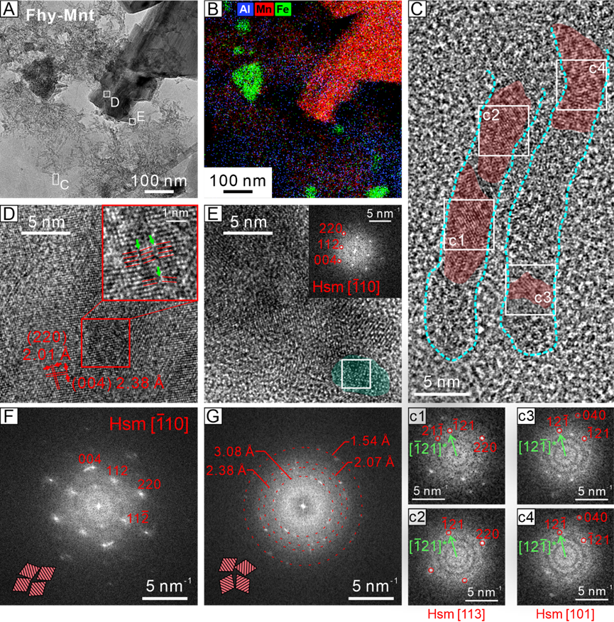 图 3 水铁矿-蒙脱石体系(Fhy-Mnt)产物微观结构特征:(A)TEM图;(B)元素分布图;图A中不同选区的HRTEM图,显示MnOx产物具有颗粒组装结构:(C)MnOx纳米纤维、(D)块状MnOx、(E)MnOx纳米纤维-块状MnOx交界处;(F、G、c1-c4)对应图D全局、图E全局、图C选区的FFT图。