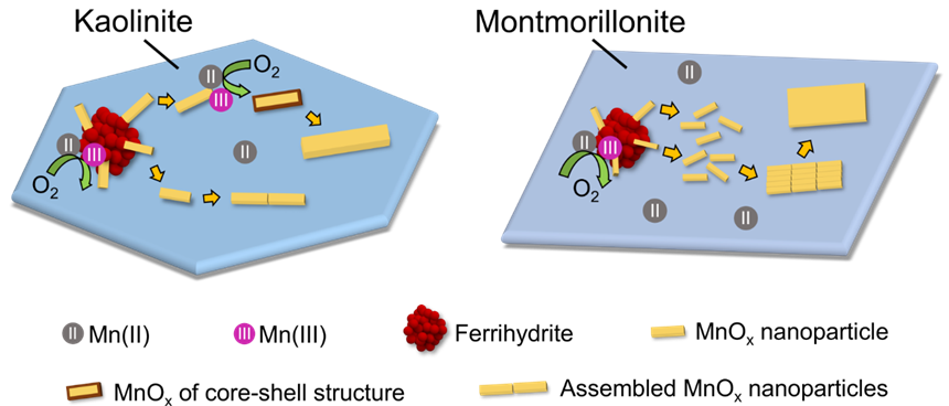 针对上述问题,中国科学院广州地球化学研究所杨奕煊、朱润良、何宏平等研究人员制备了铁氧化物(水铁矿)-黏土矿物(高岭石/蒙脱石)异质聚集体,探究了其对Mn(II)异相氧化及锰(氢)氧化物(MnOx)纳米颗粒异相结晶生长的影响,主要得到以下认识: