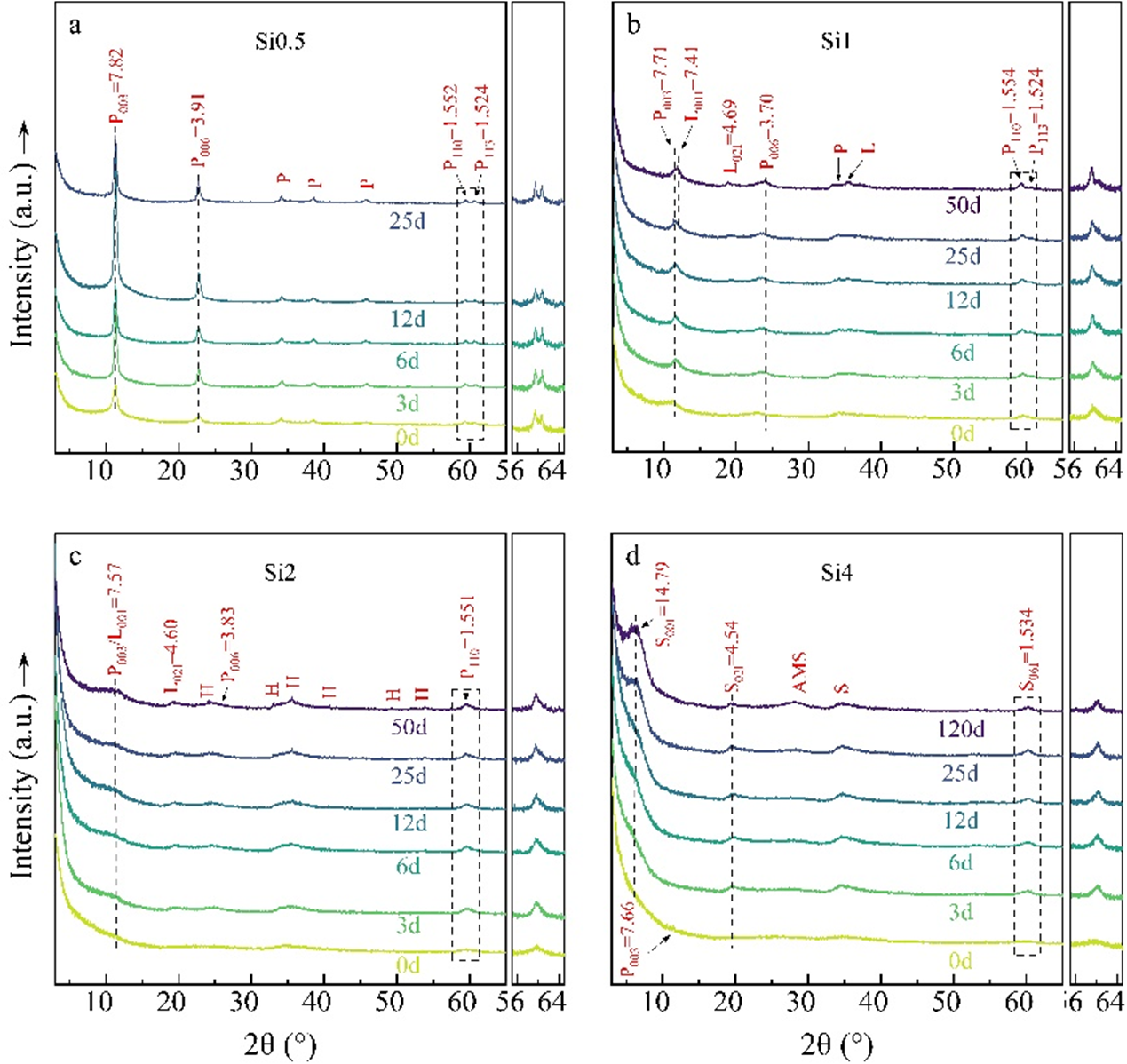 图1. 不同Si浓度下次生矿物的XRD图。