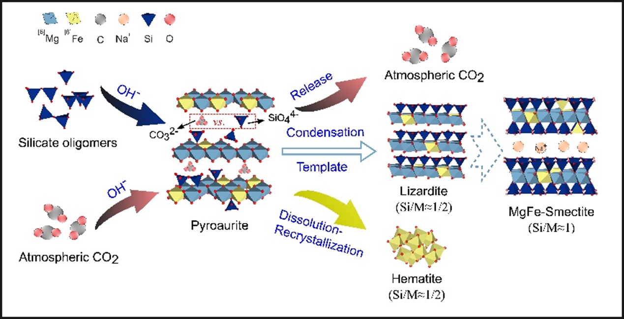 图2. 硅调控作用下水滑石(体系中为pyroaurite)向利蛇纹石(lizardite)及镁铁蒙脱石(MgFe-smectite)转化的概念模型。二氧化碳最初被固定在水滑石结构中,最后被重新释放到环境。