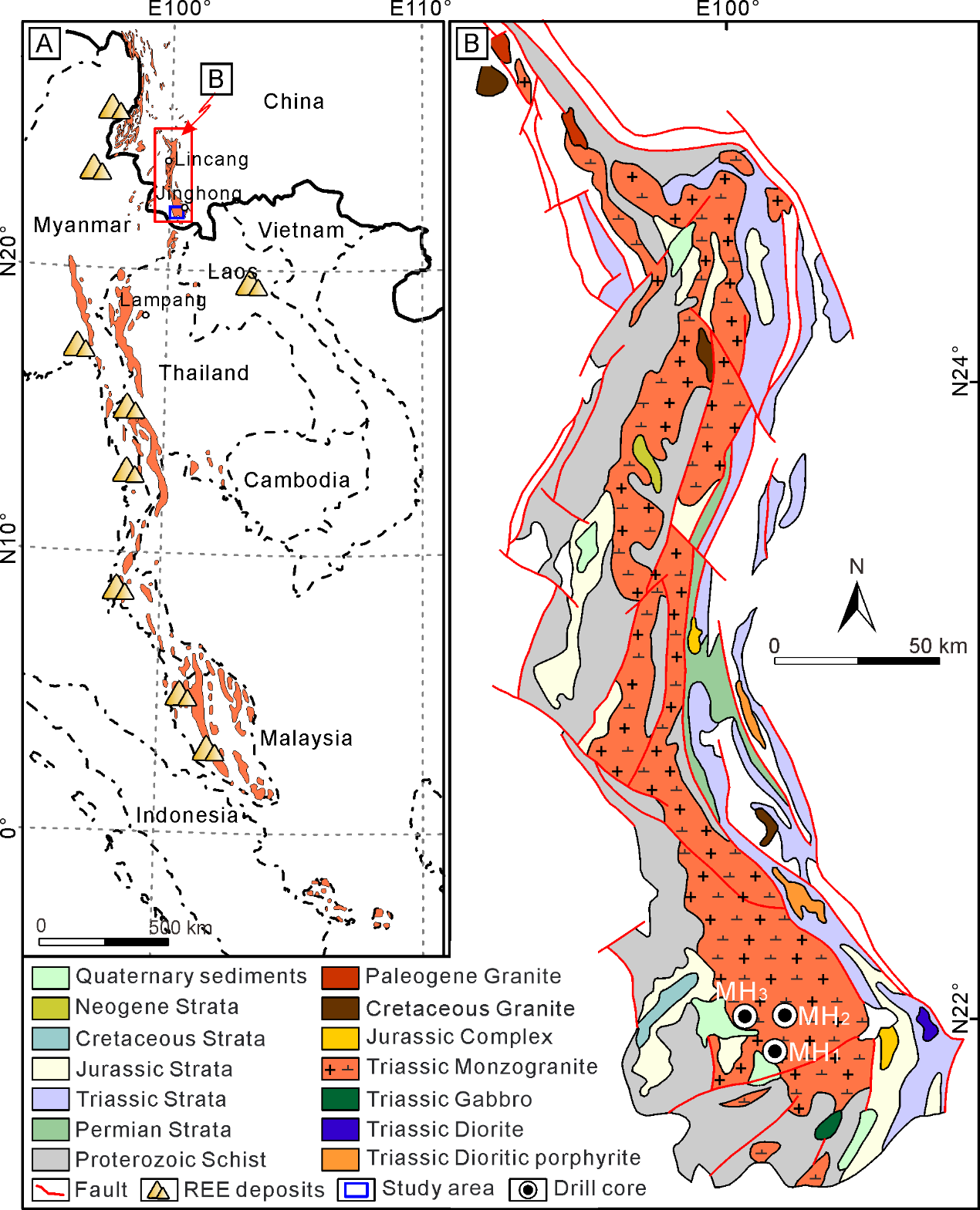 1. 与典型的华南亚热带稀土矿床相比,勐海地区在降雨量充沛和同期的高温气候条件下,形成了风化程度更强烈、风化层厚度更厚的稀土矿床。此外,勐海地区表层活跃的微生物作用促进抗风化稀土矿物(如独居石和磷钇矿)的溶解。茂密的植被覆盖和平缓且均匀分布的地形条件通过降低风化壳表层受到的物理侵蚀强度促进风化壳保存。