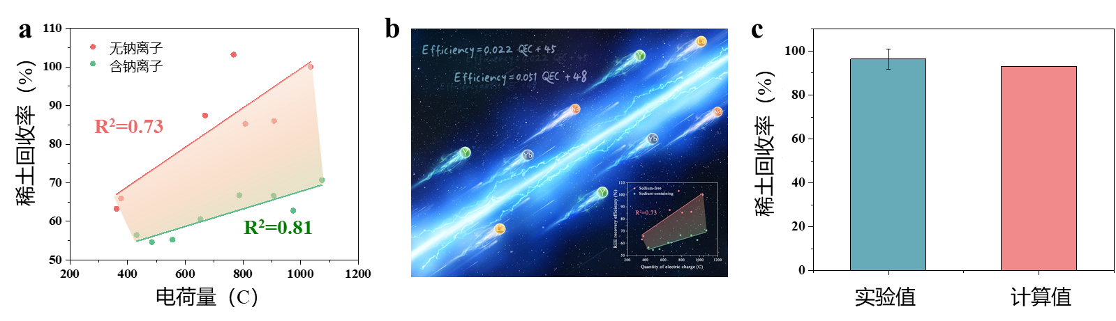 图2.(a)稀土回收率和总电荷量的拟合图,(b)电荷量和稀土回收率之间的量化关系,(c)基于单一提取剂加权后稀土元素回收率实验值与计算值的比较