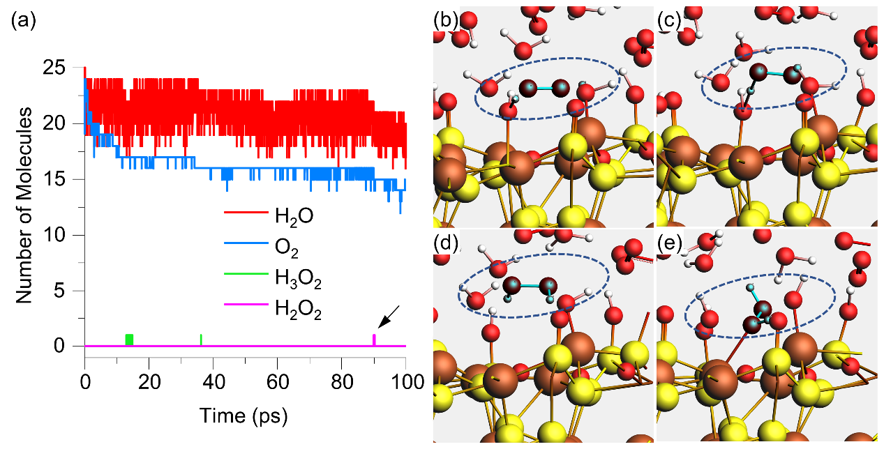 图 2. 黄铁矿{100}-V5表面被O2和H2O氧化100 ps期间的分子数变化(a);O2和H2O氧化黄铁矿{100}-V5晶面过程中形成H2O2的反应途径(b-e);蓝色高光的分子代表反应途径的示踪剂。黄色、棕色、红色和白色球分别代表S、Fe、O和H