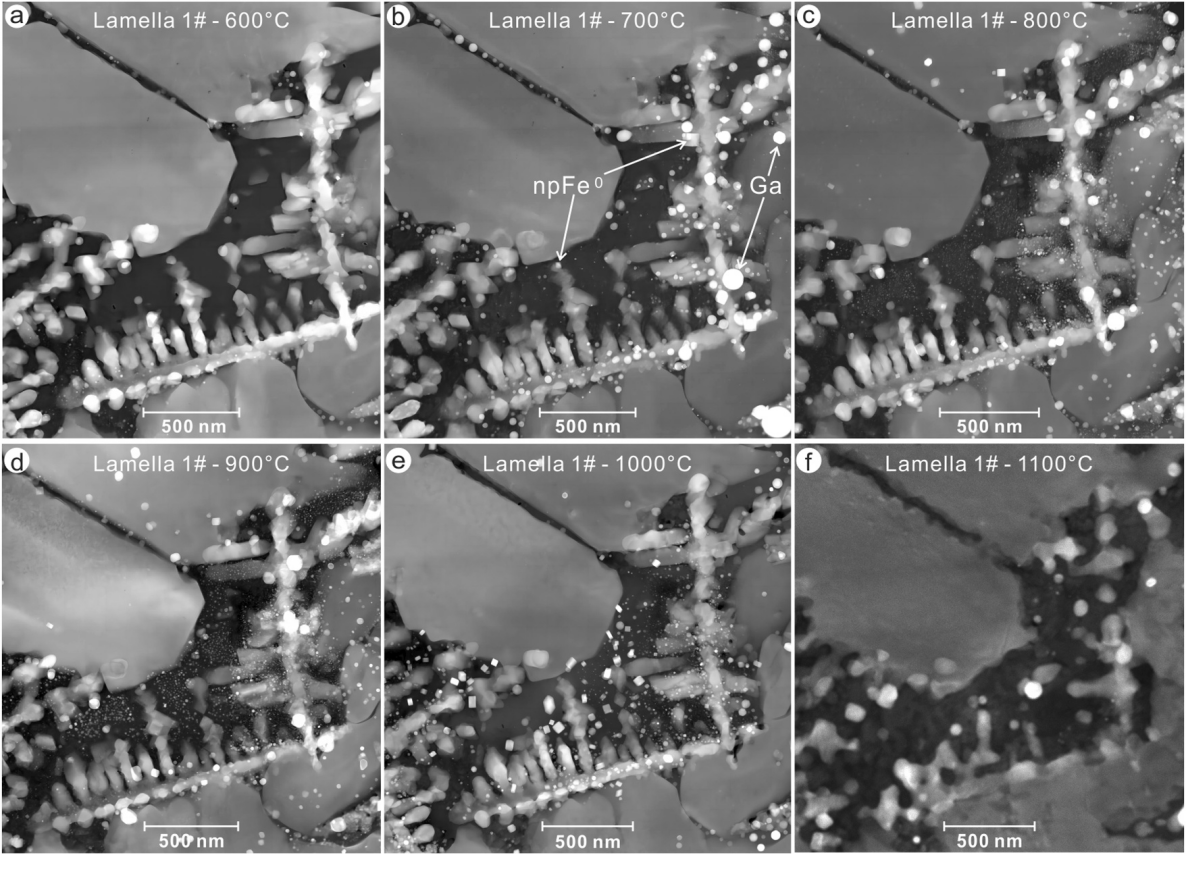 图1. 加热过程中样品的形貌变化:(a) 600°C、(b) 700°C、(c) 800°C、(d) 900°C、(e) 1000°C,以及(f) 1100°C。温度超过600°C后,玻璃中开始出现纳米金属铁(npFe⁰)