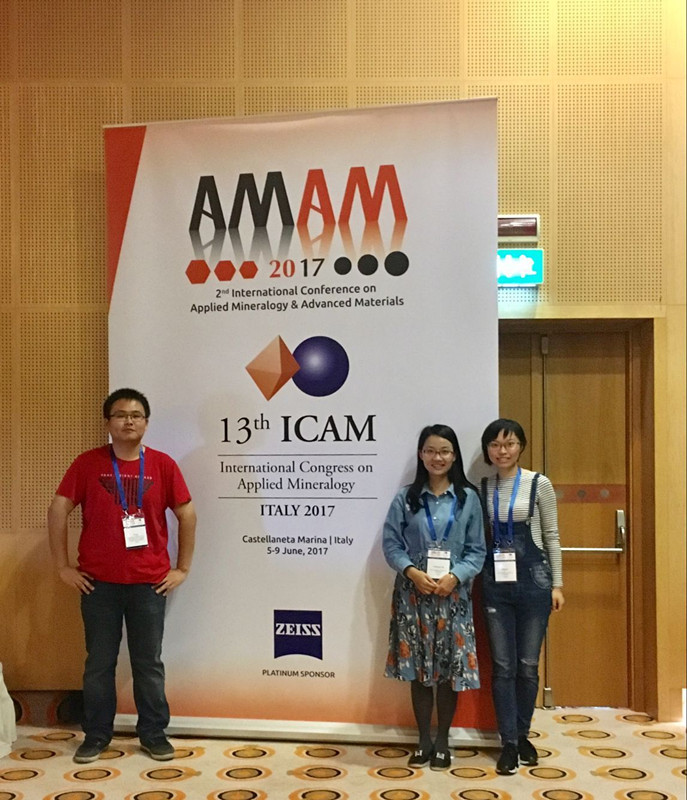 2017年6月5日-10日,徐天缘、刘鹏、刘晶三名博士研究生应意大利巴里大学Saverio Fiore教授邀参加在Castellaneta Marina举行的第13届国际应用矿物学大会。刘鹏在分组报告会上做An Efficient Catalyst of Manganese Oxides Supported on Diatomite for Toluene Oxidation 的会议报告。徐天缘和刘晶分别做海报展览Immobilized on Hydroxy-Metal Pillared Montmorillonite for the Visible Light Driven Degradation of Acid Red 18和Interaction of Polyhydroxy Fullerenes with Ferrihydrite: Adsorption, Aggregation and Degradation,并与国际同行进行交流。