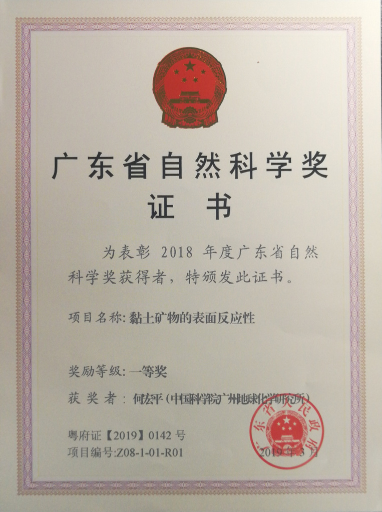 2018年广东省科学技术奖共有176个项目(人员)获奖,其中突出贡献奖2人,自然科学奖22项、技术发明奖14项、科技进步奖133项、科技合作奖5人。其中,何宏平研究员团队的成果“黏土矿物的表面反应性”获得广东省自然科学一等奖。