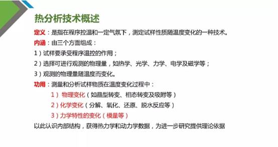 (1) 、物理变化(如晶型转变、相态转变及吸附等)。(2)、化学变化(分解、氧化、还原、脱水反应等)。(3)、力学特性的变化(模量等) 以此认识内部结构,获得热力学和动力学数据,为进一步研究提供理论依据。