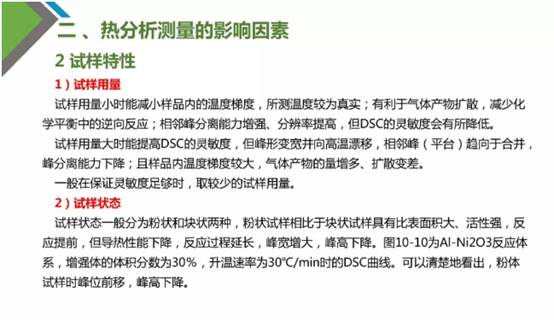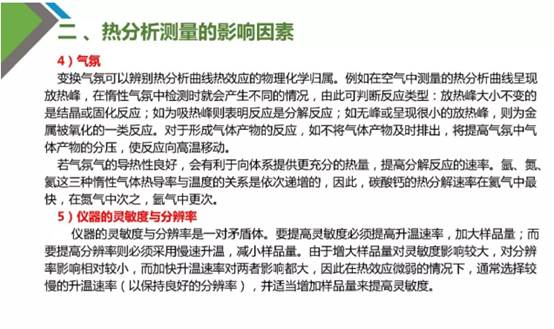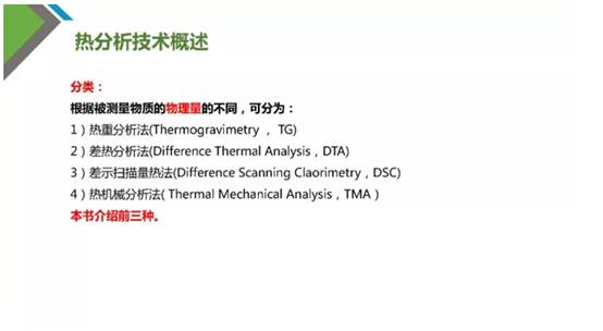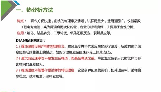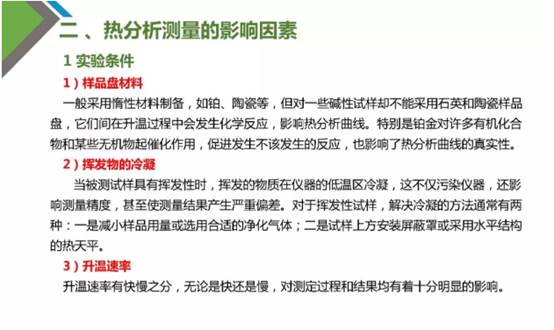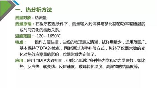 1、热分析是指在程序控温和一定气氛下,测定试样性质随温度变化的一种技术。要求:(1)、试样要承受程序温控的作用。(2)、选择可进行观测的物理量,如热学、光学、力学、电学及磁学等。(3)、观测的物理量随温度而变化。、热分析可用于测量和分析试样物质在温度变化过程中的
