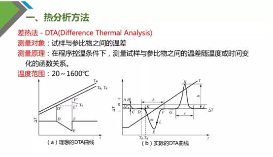 4、DTA:差热分析法,在程序控温条件下,测量试样与参比物之间的温差随温度或时间变化的函数关系。DTA曲线分析时注意:(1)、峰顶温度没有严格的物理意义。峰顶温度并不代表反应的终了温度,反应的终了温度应是后续曲线上的某点。如终了温度应在曲线EF段上的某点L处。(2)最大反应速率也不是发生在峰顶,而是在峰顶之前。峰顶温度仅表示此时试样与参比物间的温差最大。(3)峰顶温度不能看作是试样的特征温度,它受多种因素的影响,如升温速率、试样的颗粒度、试样用量、试样密度等。