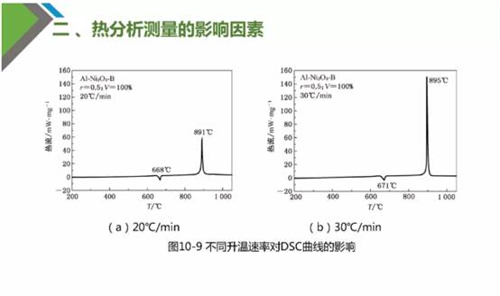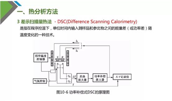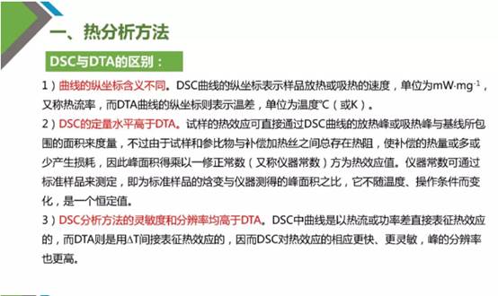 6、DSC与DTA的区别(1)、曲线的纵坐标含义不同。DSC曲线的纵坐标表示样品放热或吸热的速度,单位为mW×mg-1,又称热流率,而DTA曲线的纵坐标则表示温差,单位为温度℃(或K)。 (2)、DSC的定量水平高于DTA。试样的热效应可直接通过DSC曲线的放热峰或吸热峰与基线所包围的面积来度量,不过由于试样和参比物与补偿加热丝之间总存在热阻,使补偿的热量或多或少产生损耗,因此峰面积得乘以一修正常数(又称仪器常数)方为热效应值。仪器常数可通过标准样品来测定,即为标准样品的焓变与仪器测得的峰面积之比,它不随温度、操作条件而变化,是一个恒定值。(3)、DSC分析方法的灵敏度和分辨率均高于DTA。DSC中曲线是以热流或功率差直接表征热效应的,而DTA则是用DT间接表征热效应的,因而DSC对热效应的相应更快、更灵敏,峰的分辨率也更高。