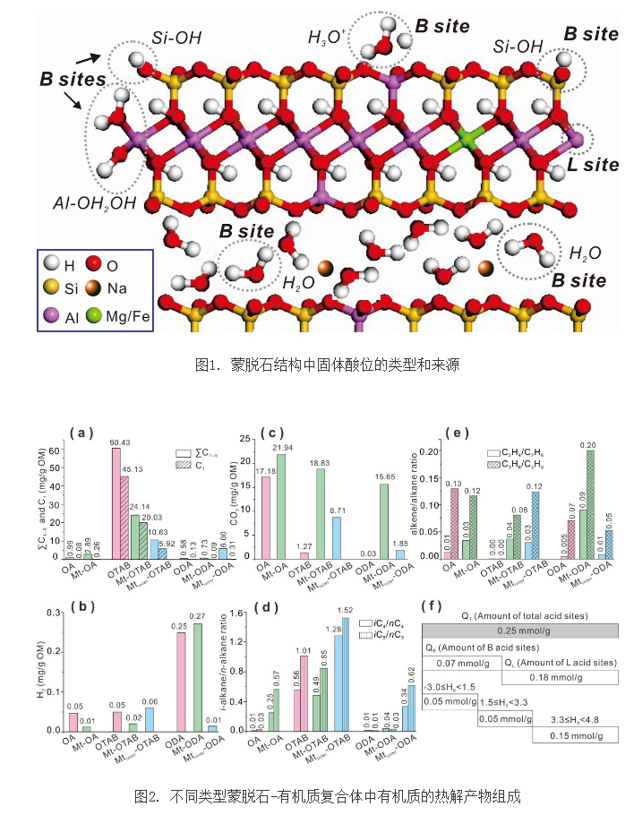 提出蒙脱石的固体酸活性位在微结构中的赋存位置及其类型是影响蒙脱石-有机质复合体中有机质热解的主要因素。区分了蒙脱石结构中不同类型固体酸位在脱羧、裂解和异构化等热解反应中的不同角色及其微观机理。