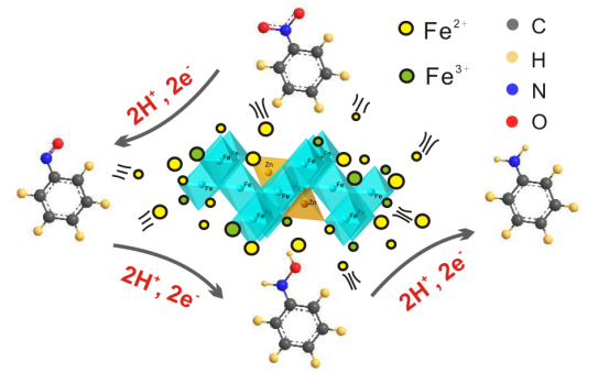 锌类质同像置换磁铁矿/游离态Fe(II)共存体系还原硝基苯机制的示意图