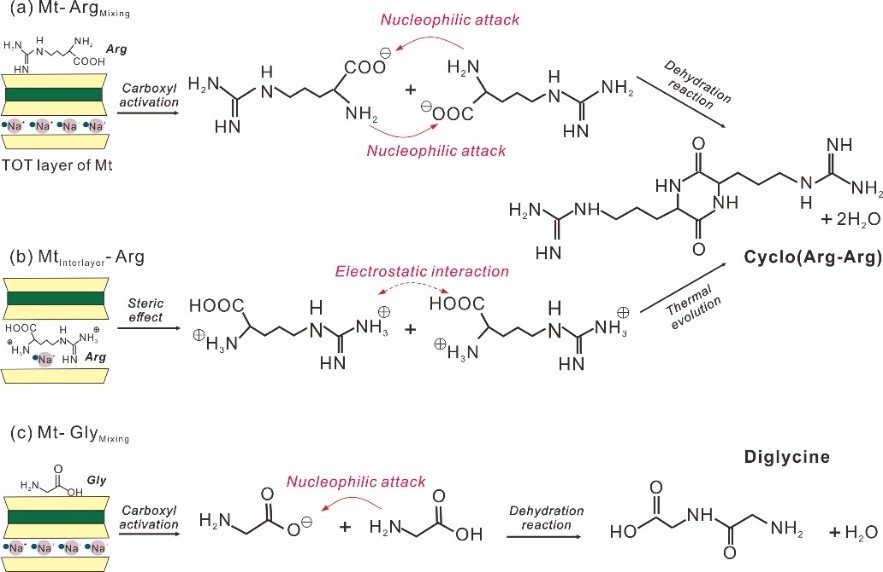 该研究工作近期获得以下新认识:提出黏土矿物的固体酸性及微结构对黏土矿物-氨基酸复合体中氨基酸的热演化具有显著影响,是其热演化反应途径、产物类型和热稳定性的关键制约因素。当氨基酸位于黏土矿物层外时,对于精氨酸等碱性氨基酸,黏土外表面固体酸位促使大分子有机质的形成温度显著低于纯相氨基酸体系;对于甘氨酸等中性氨基酸,黏土矿物强烈影响缩合产物的类型,导致黏土矿物-氨基酸复合体系的产物以线性大分子为主,而纯相氨基酸体系的缩合产物则以环状大分子为主。当氨基酸位于黏土矿物的层间域时,氨基酸热演化受空间位阻效应以及氨基酸与黏土片层之间静电作用的强烈影响,导致氨基酸分子间发生缩合形成含肽键大分子的初始温度升高。无论氨基酸存在于黏土矿物层间还是层外,其缩合所形成的有机大分子等产物的热稳定性都得到明显增强,表明黏土矿物对有机大分子产物具有保护效应。该成果近期发表于Chemical Geology,论文第一作者和通讯作者分别为卜红玲博士和袁鹏研究员。研究工作得到了国家自然科学基金、中科院青年创新促进会优秀会员项目等课题的资助。
