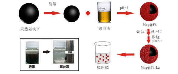 镧是一种环境友好、价格相对低廉的稀土元素,具有路易斯酸属性,其水合氧化物作为电子对接受体与磷酸根(路易斯碱)有极强的亲和性。近年来,以大比表面积的磁性材料作为镧载体的镧基吸附剂受到越来越多研究者的关注。吸附剂的载体具有的磁性可实现吸附剂在水溶液中的快速分离;较大的比表面实现了镧的均匀负载,解决了纳米级水合氧化镧易聚集的问题,有效提升了吸附剂的磷吸附能力。如Lai等合成了具有核壳结构的磁性复合物,该材料对磷的最大吸附量达27.8 mg P/g,且外加磁场可实现有效分离。值得注意的是,目前此类吸附剂的磁性大多数通过复合人工合成的磁铁矿来实现。人工合成的磁铁矿常面临成本较高、制备复杂、易被氧化等问题。而天然磁铁矿具有廉价易得、结构稳定、磁性强等特点,有望替代人工合成的磁铁矿。