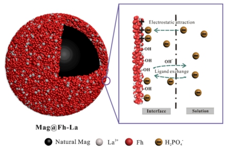 中国科学院广州地球化学研究所矿物学与成矿学重点实验室的硕士研究生傅浩洋在导师朱润良研究员的指导下使用盐酸部分酸溶天然磁铁矿,进而调节溶液pH,原位合成具有高比表面积和强磁性的水铁矿包裹磁铁矿载体(Mag@Fh),载体解决了天然磁铁矿因比表面小而难以负载功能试剂的问题。进一步的,在Mag@Fh表面均匀负载水合氧化镧,制备了一种具备高效吸磷的镧基磁性复合材料(Mag@Fh-La),具体制备过程如图1所示。通过X射线衍射(XRD)、扫描电子显微镜(SEM)、振动样品磁强计(VSM)等方法,研究对Mag@Fh-La的物相、形貌进行了分析。同时对该材料展开了批量吸附实验,吸附结果表明,Mag@Fh-La对磷酸根的吸附等温线符合Langmuir方程,最大吸附量为44.8 mg P/g,明显高于天然磁铁矿(1.6 mg/g)和Mag@Fh(9.1 mg P/g)。同时,材料受溶液pH及离子强度的影响较小,在较大pH范围和较高离子强度下均具有高吸附容量(> 30 mg P/g)。X射线光电子能谱分析(XPS)和傅立叶红外光谱仪(FTIR)表征结果显示,Mag@Fh-La对磷酸根的吸附主要通过材料表面的羟基与溶液中的磷酸根发生配体交换来实现,具体的吸附机理见图2。吸附-脱附-再生实验结果表明,磷再生量随循环次数的增加变化不明显。经4次循环后,磷吸附量仍可达到原始饱和吸附量的90%左右。因此,材料具有反复利用和回收磷资源的潜力。综上所述,本研究制备的Mag@Fh-La具有廉价、高效、易分离、可再生的特点,有望成为一种具有实际应用前景的理想磷吸附材料。