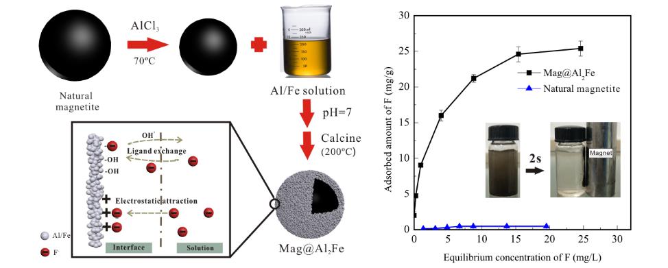 前人研究表明铁离子与氟离子具有较强的亲和力,且铁基材料在较大的pH范围内可稳定脱氟。对此,中国科学院广州地球化学研究所矿物学与成矿学重点实验室的硕士研究生傅浩洋在导师朱润良研究员的指导下以天然磁铁矿为前驱体,通过溶解-再结晶法在铝基材料中原位掺杂铁元素一步研制出易分离、稳定的高性能Al/Fe双金属复合吸附材料。具体的实验流程如图1,实验利用氯化铝水解产生的H+部分刻蚀磁铁矿,并将所得的混合溶液调整pH至中性,老化一定时间后原位合成Al/Fe双金属(羟基)氧化物包裹磁铁矿材料(Mag@Al2Fe)。研究通过X射线衍射(XRD)、扫描电子显微镜(SEM)、振动样品磁强计(VSM)、N2吸/脱附曲线等方法探究了Mag@Al2Fe的物相、形貌,并分析了材料的吸附性能。表征结果显示Al/Fe双金属(羟基)氧化物均匀的包裹在刻蚀后的磁铁矿表面,且材料具备高饱和磁化强度(62 emu/g)、大比表面积(90.0 m2/g)及由微孔、介孔组成的多级孔结构。批量吸附实验表明Mag@Al2Fe的饱和吸附容量为26.5 mg/g,明显高于磁铁矿的1.44 mg/g(图1)。此外,吸附剂具备快速吸附的特点,材料仅需120 min即可达到吸附平衡。在酸性和碱性溶液中低溶解度的铁元素掺杂可有效抑制材料中铝离子溶解,使Mag@Al2Fe在pH 4~9范围内均表现出良好吸附性能。X射线光电子能谱分析(XPS)和pH边实验结果表明,Mag@Al2Fe对氟离子的吸附主要通过静电作用和材料表面的羟基与溶液中的氟离子发生配体交换进而形成Al-F和Fe-F键实现,具体的吸附机理见图1。综上所述,本工作提供了一种合成简单、成本低廉、效率高、可分离的磁性复合吸附剂。Mag@Al2Fe可作为一种有前景的双金属复合吸附剂,有望在饮用水脱氟方面得到广泛应用。