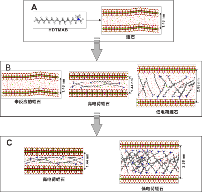 中国科学院广州地球化学研究所矿物学与成矿学重点实验室的苏小丽博士,以蛭石矿物为原料,将不同浓度十六烷基三甲基铵根离子引入蛭石矿物层间域内,制备了有机蛭石。研究表明,蛭石矿物层电荷密度的不均匀导致有机蛭石非均匀结构特征形成,有机蛭石结构演化如图1所示,其疏水性和热稳定性增加。