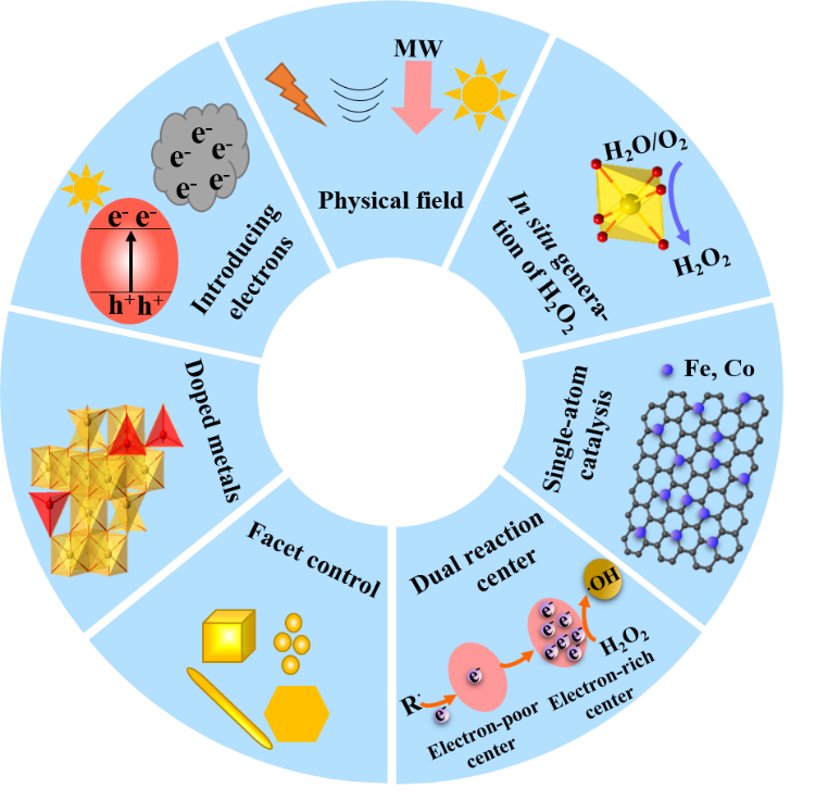中国科学院广州地球化学研究所矿物学与成矿学重点实验室的朱雁平研究生在综述了近年来国内外关于如何提升异相芬顿催化活性的研究进展,整理并比较了一些常见的方法及其增强异相芬顿反应的潜在机制。在异相芬顿催化体系中,通过Fe(II)和H2O2反应生成·OH是整个降解污染物反应过程中最核心、最高效的一步。据此,前人提出了一系列方法,如加速Fe(II)的再生、促进H2O2的分解以及原位生成H2O2等,这些方法显著地增强了异相芬顿反应活性。基于这些理论指导,许多研究者进行了大量的相关研究,例如:从外部电场、富电子材料、半导体、等离子体及掺杂金属中引入电子加速Fe(III)的还原;通过调控异相芬顿催化剂暴露出来的晶面和形貌促进H2O2的分解;将异相芬顿催化剂与超声、电场、半导体及含铁催化剂结合原位产生H2O2。此外,最近一些新型、高效的异相类芬顿催化反应,如构建双反应中心(即富电子中心和贫电子中心)和单原子类芬顿催化技术等,也能对异相芬顿催化体系的构建提供指导和启发。上述的这些高效增强异相芬顿/类芬顿催化反应的方法见图1。
