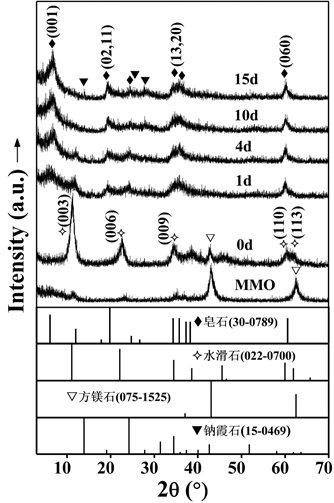 X射线衍射(XRD)结果显示,在Si-O阴离子共存的碱性条件下,金属氧化物首先快速水合,形成水滑石矿物相(图2)。随后,水滑石逐渐减少,并逐渐被蒙皂石矿物取代。产物经乙二醇饱和,(001)晶面的d值由1.286 nm增至1.663 nm;同时, 其(060)晶面的d值为0.154 nm, 证实最终产物为具有三八面体的皂石矿物。
