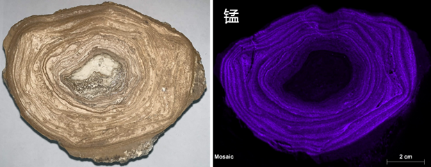 图2. 柴达木盆地碳酸盐结核的圈层结构。浅色圈层的锰含量更高,碳酸盐结晶度更好,孔隙度更大,代表形成环境的盐度更高。