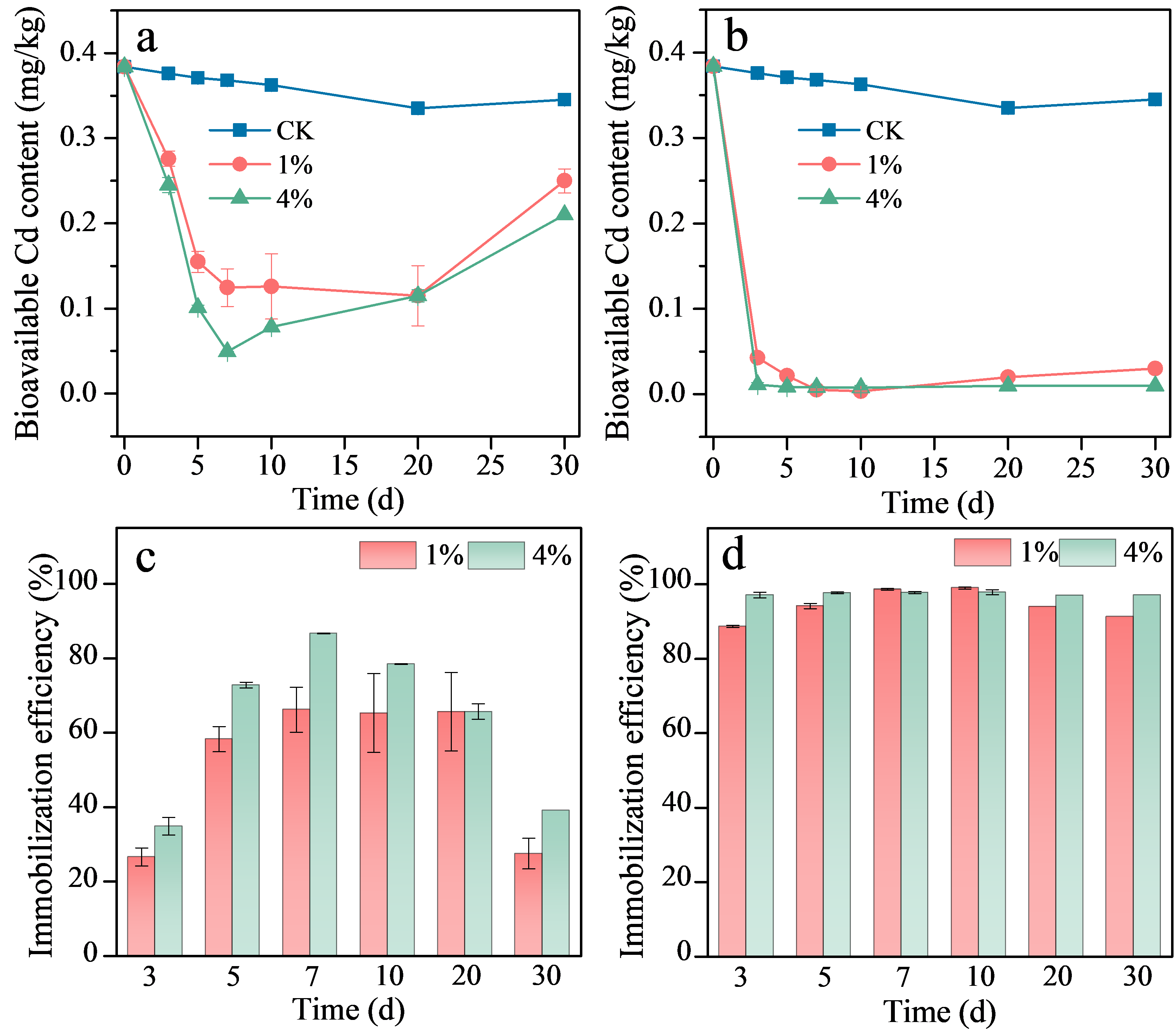 图1. 不同投加比例Mt(a)和KMt-P(b)处理后土壤有效态Cd含量,Mt(c)和KMt-P(d)对土壤Cd的钝化率