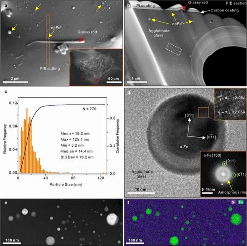 研究团队首先在嫦娥五号月壤样品中挑选了~100 μm尺寸的凝结碎屑颗粒,并通过扫描电子显微镜(SEM)对凝结颗粒表面进行了详细观察。在凝结玻璃表面观察到了由微陨石撞击作用产生的玻璃棒以及纳米单质铁球(图1a)。通过聚焦离子束(FIB)对样品进行加工,获得透射电子显微镜(TEM)可观测的薄片(图1b)。研究团队对凝结玻璃及其中赋存的纳米单质铁进行了形态、化学成分和结构分析(图1c-f),发现纳米单质铁为通常太空风化产生的阿尔法铁,平均尺寸为16.2 nm。