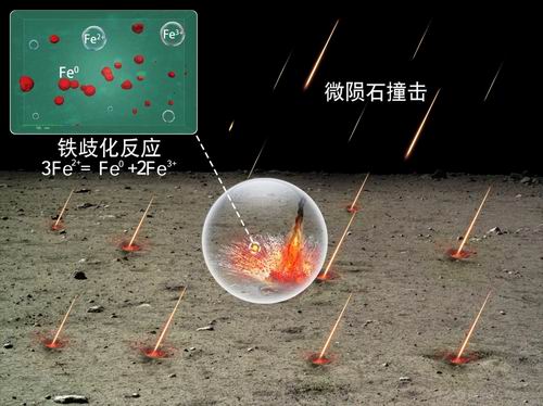 这一歧化反应可发生在微陨石撞击形成的高温高压阶段,也可能发生在冲击熔融冷却阶段。月表普遍存在的凝结玻璃中大量三价铁的发现预示着月球表面存在着比人们以往认识更多的Fe3+,且Fe3+的含量还会随着微陨石撞击作用的持续进行而不断累积。
