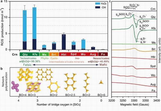 为了寻找太古代具有重要地质意义的氧化剂来源,中国科学院广州地球化学研究所何宏平研究员团队基于前期发现的石英表面自由基与水反应产生氧气(O2)和过氧化氢(H2O2)等活性氧(ROS)的机制,选取了岛状、环状、链状、层状和架状结构的硅酸盐矿物,开展了太古代物理风化环境下矿物–水界面作用的模拟研究。研究发现,大多数硅酸盐矿物经机械磨蚀后均可产生ROS,架状结构矿物(长石和石英)中Si–O键均裂更容易形成自由基(SiO•和SiOO•),其ROS产量显著高于橄榄石、辉石等具低聚合度硅氧骨架的矿物(图1)。通过大数据汇编分析发现,在太古代时期,大陆地壳物理风化导致的ROS产量随地壳SiO2含量的升高和构造运动的增强而显著增加(图2)。