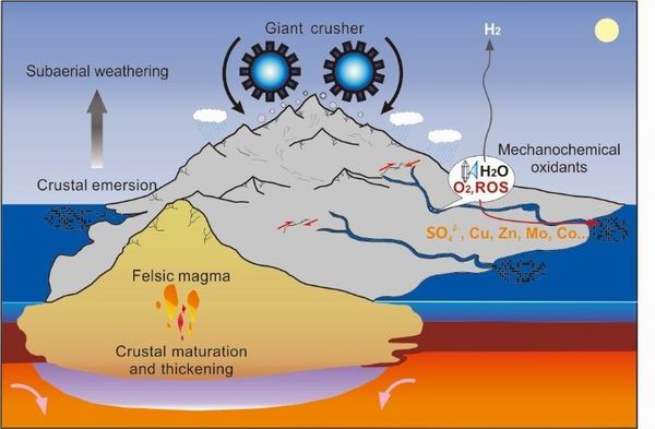 研究团队提出,超级山脉的物理风化可构成中太古代的“产氧工厂”(图3)。当时大陆上的矿物机械化学产氧通量达到1.73×108~1.17×109 mol yr-1,并随着大陆地壳的生长和长英质化而渐进增加,这足以引发太古代局部氧化风化事件。值得注意的是,矿物机械化学氧化剂产量的时空变化本质上是地表环境对地球深部过程的响应,活性氧的氧化作用驱使大量营养元素迁移至太古代海洋,促进早期海洋生产力的兴盛,驱动岩石圈–生物圈的协同演化,加速了早期地球宜居性演变。