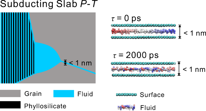 大洋板片的俯冲是水进入地球深部的方式。俯冲板片的含水矿物在高温高压条件下发生变质脱水反应释放流体。那么,究竟这些流体是伴随板片俯冲进入地球更深处、还是上涌到地球的浅部,取决于岩石的渗透率。依据结构平衡(textural equilibrium)理论,岩石的渗透性通过测量矿物颗粒间的二面角来衡量。一般认为,若矿物颗粒间的二面角小于60°,则流体可以在晶粒边缘连通,致使岩石具有较高的渗透率,那么密度小于岩石的流体会上涌;若二面角大于60°,则流体不连通,流体会伴随板片俯冲进入地球深部。然而,该理论存在缺陷为:仅以纯相流体为假设,没有在分子-原子水平上认识到低维度空间中流体的特殊性。而利用当今分子动力学模拟手段对流体/矿物进行研究,可以在分子-原子水平上认识流体结构、稳定性和运移方式,产生新的科学发现。