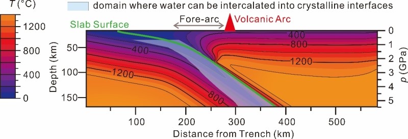 研究者对几种晶体边界进行研究,发现若晶体表面与水之间不形成稳定的氢键网络结构(如石墨和云母的表面),低维度流体可以形成于晶体边界。研究者对一系列温度-压力条件的研究揭示了俯冲板片内低维度流体稳定存在的区间(图2)。低维度流体是俯冲板片矿物脱水形成的,该流体在岩石中的连通致使岩石具有较高的表观渗透率,促进流体在俯冲板片内上涌。