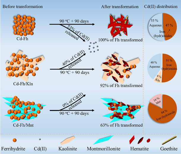 近日,中国科学院广州地球化学研究所朱润良研究员团队为深入理解Cd(II)在土壤中长期赋存行为,以黏土矿物(高岭石、蒙脱石)和铁氧化物(水铁矿)作为土壤组分的两类代表,深入探讨了黏土矿物与水铁矿的相互作用过程,以及该相互作用过程如何影响土壤中重金属离子(Cd(II))的归趋。