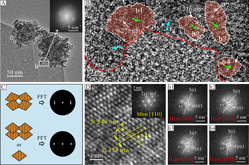 图2. 高岭石体系中MnOx的结构特征:(A)高岭石表面的MnOx聚集体;(B)选定区域的HRTEM图和对应FFT花样,表明聚集体中存在无定型锰氧化物和取向相似的黑锰矿纳米颗粒;(C)颗粒聚集状态与FFT花样的对应关系;(D)选定区域的HRTEM图和对应FFT花样,表明聚集体中存在水锰矿纳米颗粒。