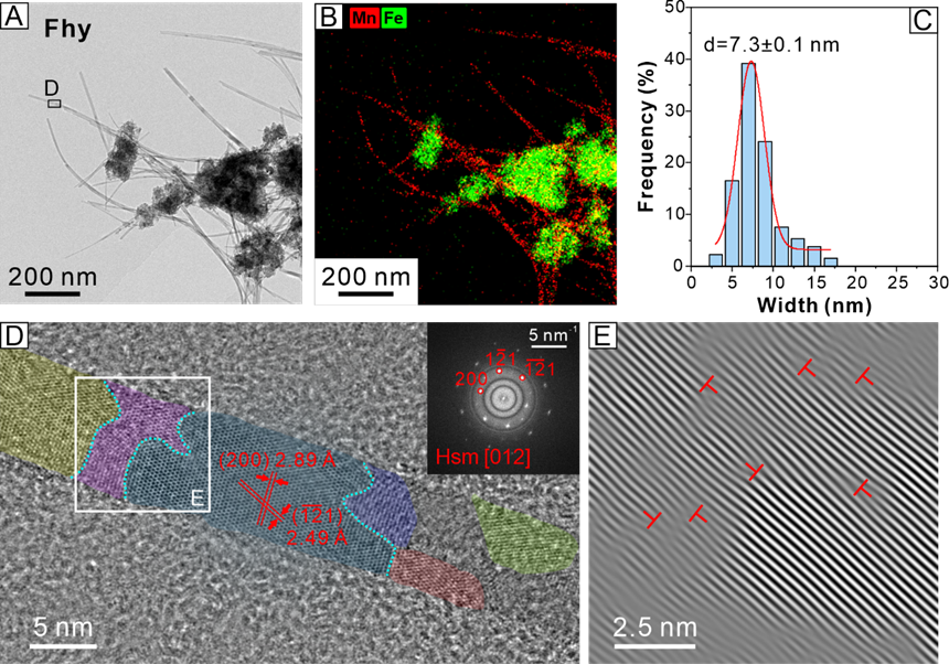 图 1 水铁矿体系(Fhy)产物微观结构特征:(A)TEM图;(B)元素分布图;(C)MnOx颗粒宽度分布图(C);(D)图A中选区的HRTEM图,显示MnOx产物具有颗粒组装结构;(E)图D中选定区域的IFFT图,显示颗粒边界处位错。