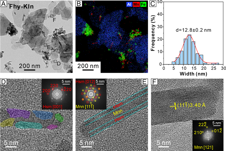 图 2 水铁矿-高岭石体系(Fhy-Kln)产物微观结构特征:(A)TEM图;(B)元素分布图;(C)MnOx颗粒宽度分布图;图A中选区的HRTEM图,显示MnOx产物具有不同结构:颗粒组装(D)、核壳(E)、单晶(F)。