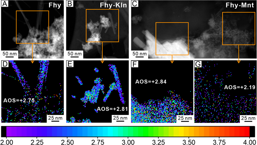 图 4 水铁矿、水铁矿-高岭石、水铁矿-蒙脱石体系产物的Mn-L2,3电子能量损失谱(EELS)面扫结果,显示Mn平均氧化态(AOS)的纳米尺度二维空间分布特征。