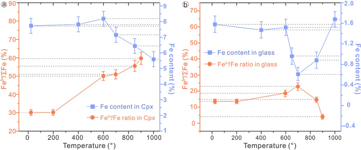 (a) 单斜辉石的铁含量(蓝色)及Fe3+/∑Fe比值(橙色)随温度的变化;(b) 玻璃的铁含量(蓝色)及Fe3+/∑Fe比值(橙色)随温度的变化