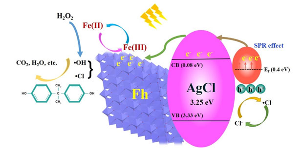 中国科学院广州地球化学研究所矿物学与成矿学重点实验室的朱雁平研究生在研究Ag/AgCl/Fh光助芬顿催化中发现在Fh表面负载Ag/AgCl复合材料可实现高效异相芬顿催化活性。